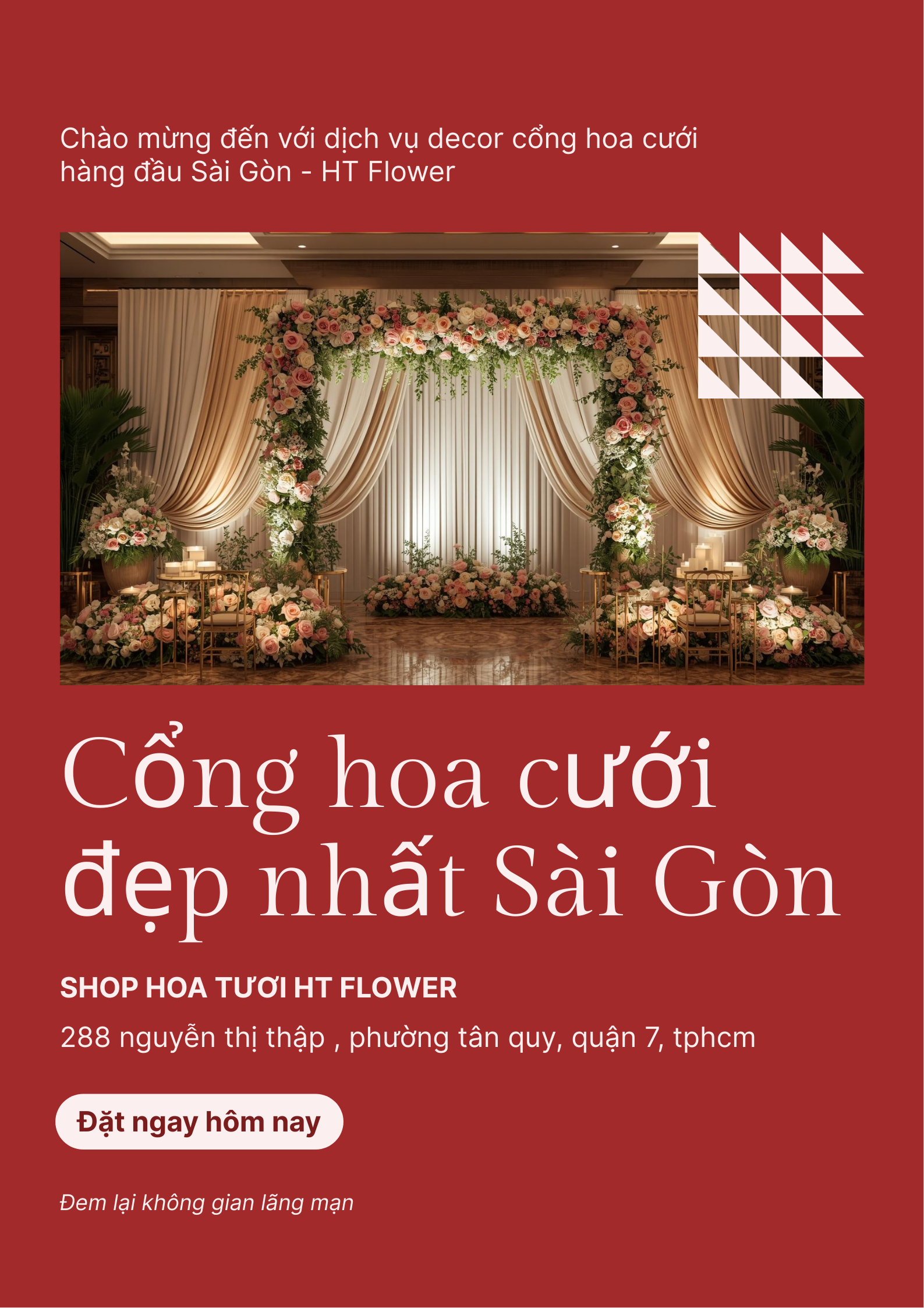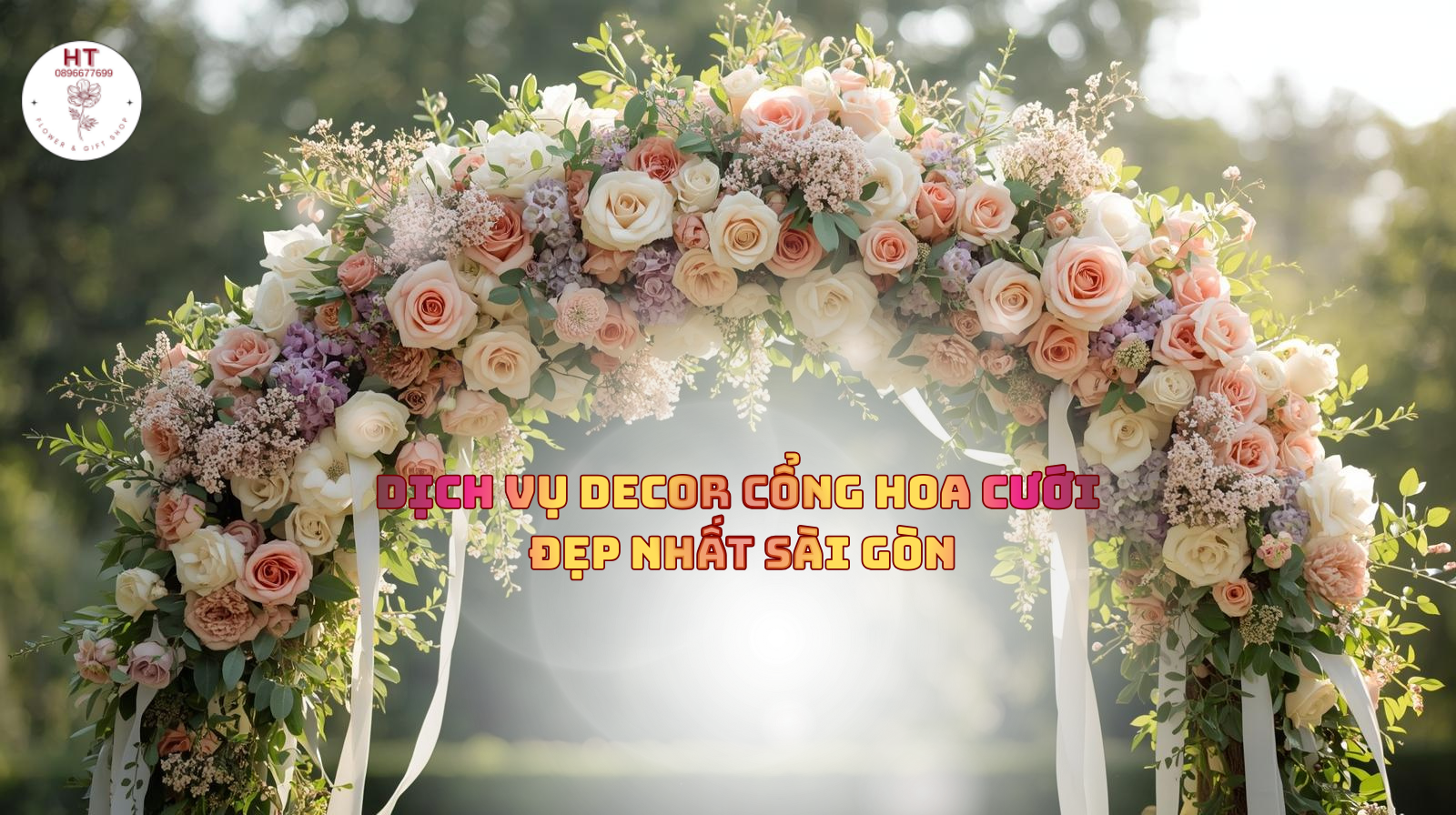 HT Flower tự hào mang đến dịch vụ decor cổng hoa cưới chuyên nghiệp tại Sài Gòn, giúp không gian tiệc cưới thêm lãng mạn, tinh tế và ghi dấu ấn khó quên trong trái tim cô dâu chú rể và quan khách.
