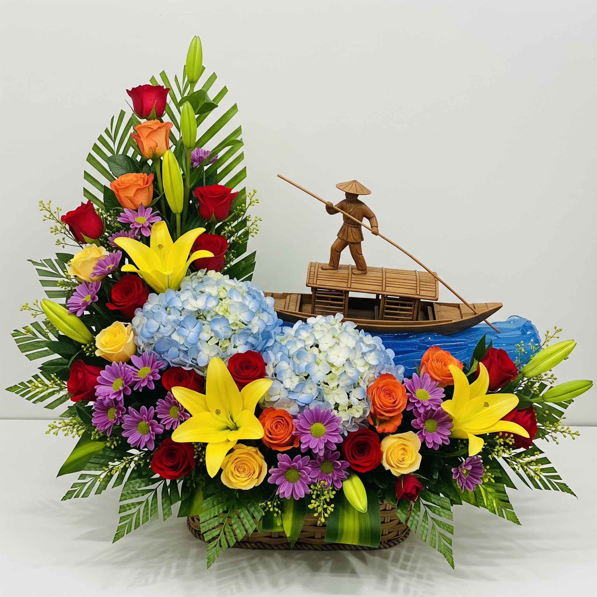 Ý nghĩa thuyết trình: Mẫu hoa “Người đưa đò” lấy cảm hứng từ hình ảnh quen thuộc nhưng đầy trân quý của người thầy, người cô – những con người lặng lẽ chèo lái con đò tri thức đưa bao thế hệ học trò qua sông, cập bến tương lai. Mỗi bông hoa trong tác phẩm tượng trưng cho sự tận tâm, kiên nhẫn và tình yêu nghề của thầy cô, dù mưa nắng vẫn bền bỉ dìu dắt học trò nên người. Con đò kết từ hoa thể hiện hành trình dài đầy ý nghĩa, còn sắc hoa rực rỡ tượng trưng cho thành quả ngọt ngào – chính là những học trò trưởng thành, thành công. Tác phẩm là lời tri ân sâu sắc, tôn vinh công lao to lớn và tấm lòng cao cả của những “người đưa đò thầm lặng” trong Ngày Nhà giáo Việt Nam 20/11.