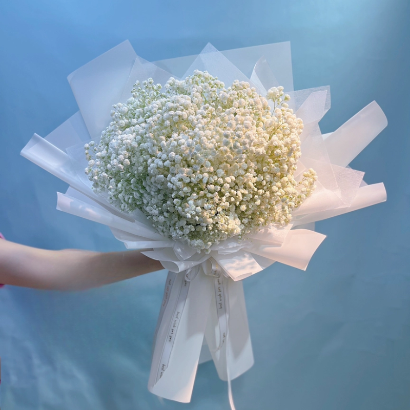 Bên cạnh những loài hoa nổi bật ấy, hoa baby cũng được nhiều người lựa chọn bởi ý nghĩa nhẹ nhàng mà sâu sắc. Những bông hoa nhỏ bé, trắng tinh khôi của baby tượng trưng cho sự giản dị, trong sáng và những khởi đầu mới. Trong lễ tốt nghiệp, hoa baby thường được dùng để bó riêng hoặc làm nền cho các loài hoa khác, như một cách nhấn mạnh rằng: dù bước vào cuộc sống rộng lớn, con người vẫn nên giữ cho mình sự khiêm nhường, thuần khiết và lòng biết ơn đối với quá khứ.