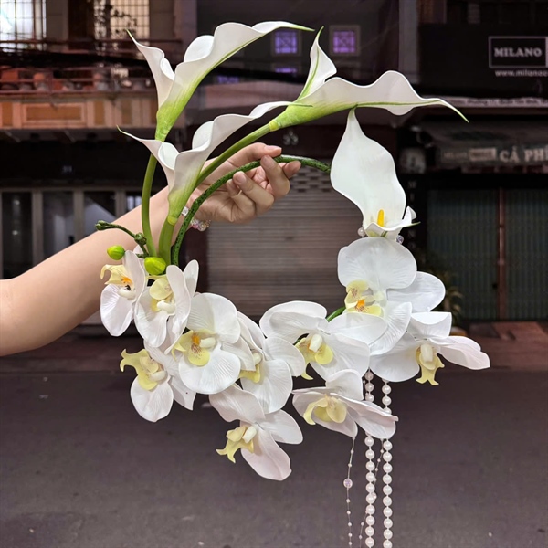 Với thiết kế hình tròn mềm mại, kiểu hoa cưới dạng vòng tạo cảm giác hài hòa và tinh tế. Những bó hoa này thường được điểm thêm những hạt ngọc trai hoặc nơ nhẹ nhàng, tôn lên nét thanh lịch và sang trọng cho cô dâu. Phong cách này phù hợp với các cô dâu yêu thích sự nhẹ nhàng và trang nhã.